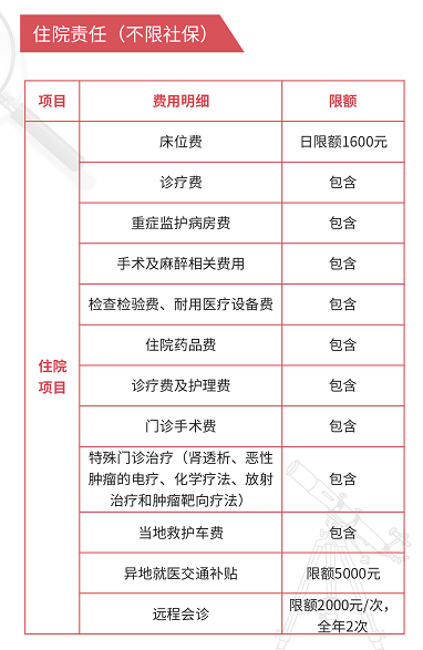 ➤ 保障项目丰富。住院责任涵盖了:床位费、诊疗费、重症监护费、手术及麻醉相关费用、药品费用等常规住院费用,值得一提的是耐用医疗设备费也是包含在内的;还涵盖了特殊门诊治疗、门诊手术费、当地救护车费。