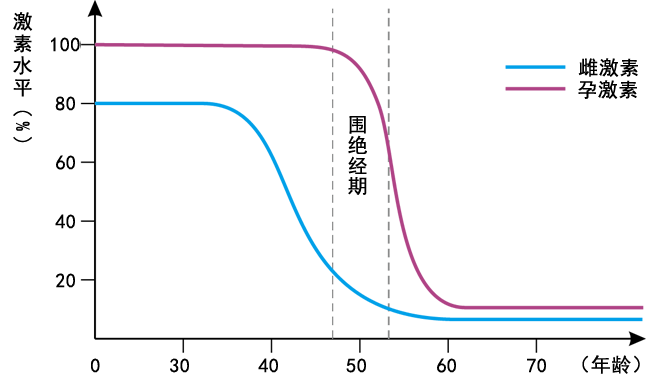 当进入围绝经期以后,女性卵巢功能开始衰退,体内雌孕激素就开始波动下降,当卵巢功能完全丧失,雌孕激素降低到一定水平,就会出现绝经。