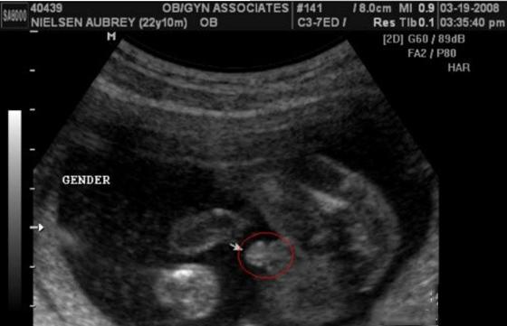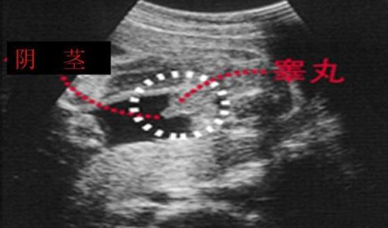男宝宝的B超图上其实是能看到小鸡鸡的,图片的红圈处就是。这张图片上的小鸡鸡非常清晰,医生很厉害,她取的那个角度就是宝宝的屁股正下方,看的特清楚。
