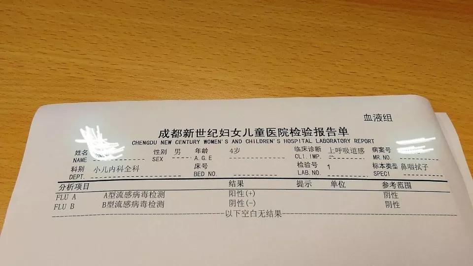 一早起来,阿酒依然在发热,赶紧叫醒爸爸开车送我们去医院,八点的医院简直空空荡荡,只有一个小朋友正在看诊,我们今天看的张华老师,我们先开单做了血常规的检查,报告看起来问题不大,像病毒感染。我跟张老师描述了整个病程,也提出了我的担忧,会不会是流感,张老师建议做一个流感快速检测,从阿酒的鼻腔取了一些分泌物做检查。这个检查大概需要一个小时就可以出结果,我先去病房忙,爸爸带阿酒吃饭,等待检查结果。